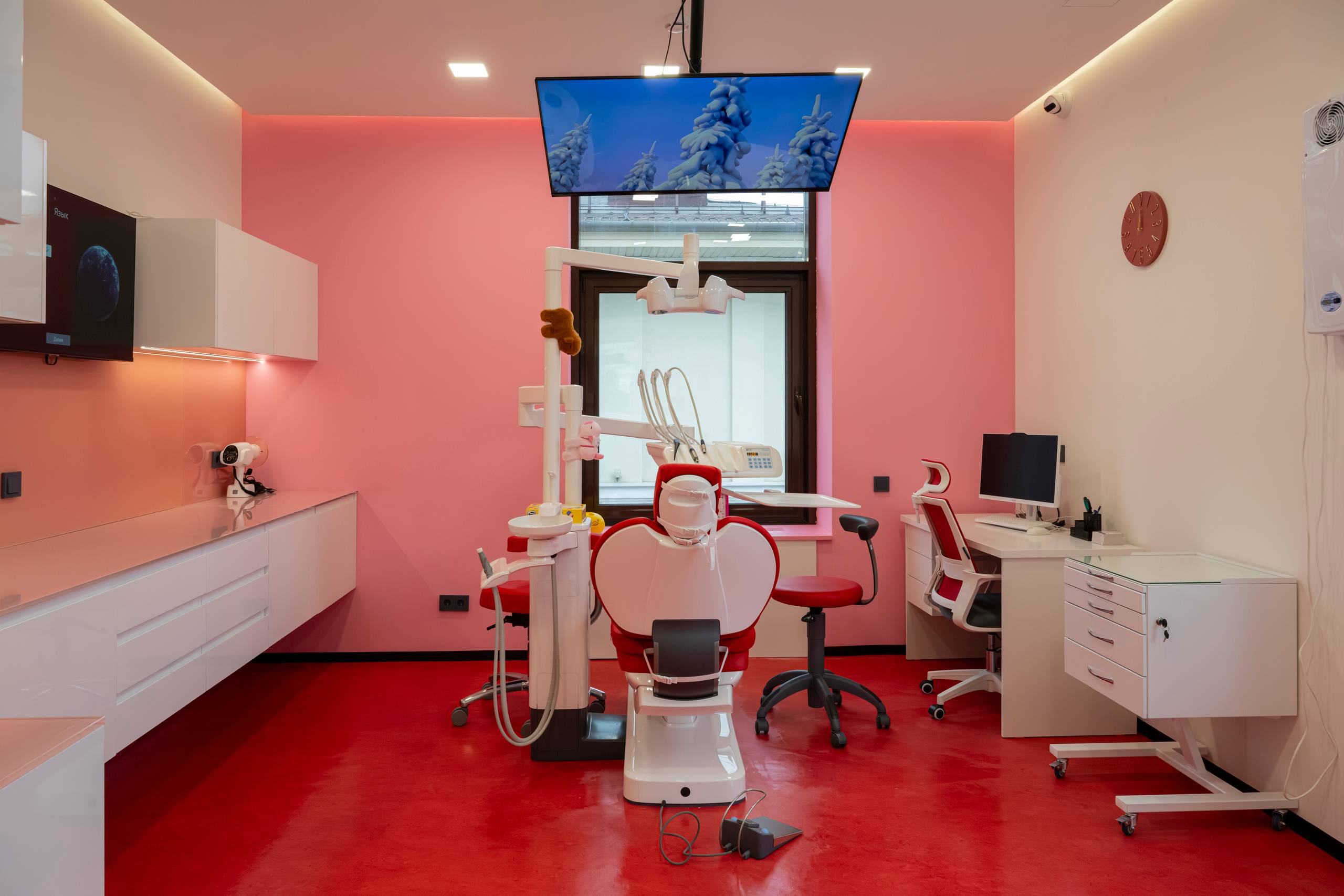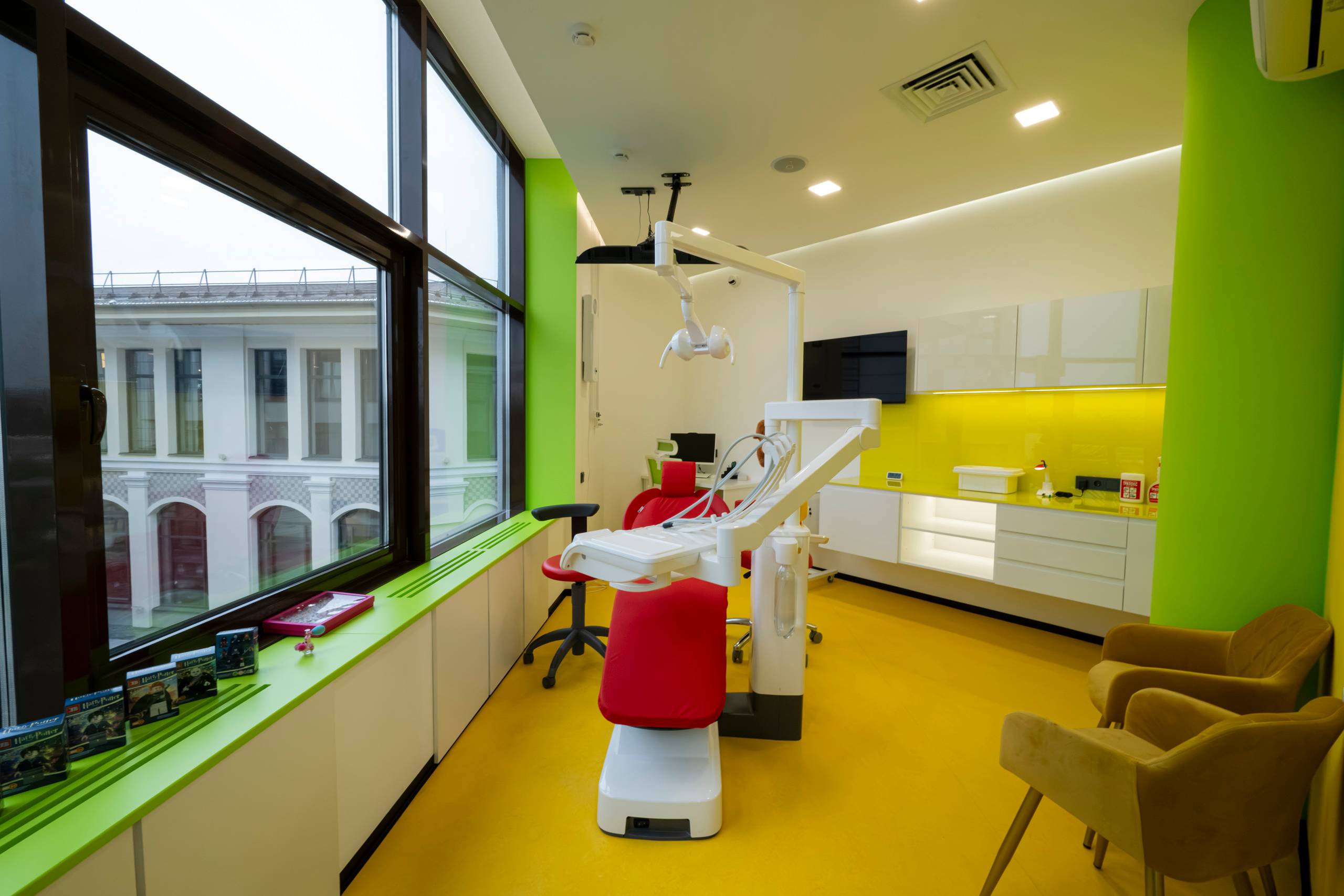 Для взрослых — комфортные кабинеты и понятный процесс. Для детей — игровая зона, где можно заняться делом до или после приёма или подождать родителей с аниматором.